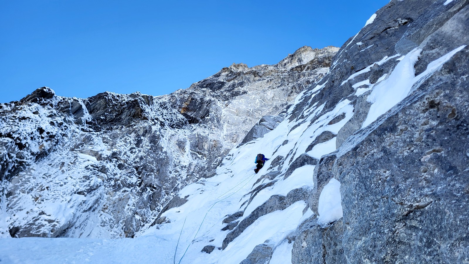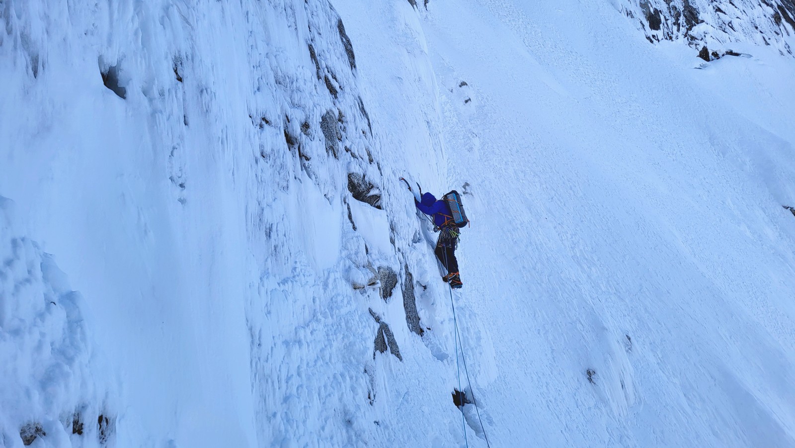 Naslednji dan sva se le stežka aktiviral. Kvaliteta snega se je z višino slabšala. Vse več je bilo strmega terena in nesprijetega snega, ki sem ga počasi odkopaval, da sem dosegel podrto skalo pod njim. Zajeda, ki sva ji sledila, je v sredini široka dobrih 50 m. Sprva sva se držala njenega levega roba, v grabnu je bilo vse manj snega. Po dveh raztežajih napornega kombiniranega plezanja (M5, M6+) sem se težavam skušal ogniti po delikatnem sistemu polic z naloženim snegom na desni. Napredovala sva počasi – stojišča si je bilo treba izkopati v globokem pršiču. V retrospektivi … mogoče bi napredovala hitreje, če bi se ves čas držala leve. Okoli treh naju prehodi, ki sva jih označila za najbolj naravne, pripeljejo do pokončnih gladkih plat, prekritih s tankim ledom, ki je odpadel že ob najmanjši obremenitvi. V iskanju alternativnega obhoda sem najprej poizkusil v suhem previsnem kaminu, a sem v četrt ure uspel napredovati za le dva metra. Medtem ko molče razmišljava o begu, opaziva vzporeden sistem skalnatih polic, katerega sva dosegla po desetmetrskem suhem odseku majavih lusk. Polica se po dveh raztežajih skalnega sveta (V+/V) zapre slabih 100 metrov pred vrhom. S spustom po vrvi in nihajno prečko sva se spustila nazaj v zajedo, kjer naju je ujela noč. Do vrha stene naju je ločil še poln raztežaj strmih plat, prekritih z metrom svežega nesprijetega snega. Napredovala sva počasi. S cepinom sem sistematično odkopaval sneg, iskal razčlembe v skali in se z nogami poizkušal obdržati na krhkih kupih pršiča. Vrh stene, na višini približno 5850 m sva dosegla ob devetih zvečer in bivakirala pod skalnim previsom.