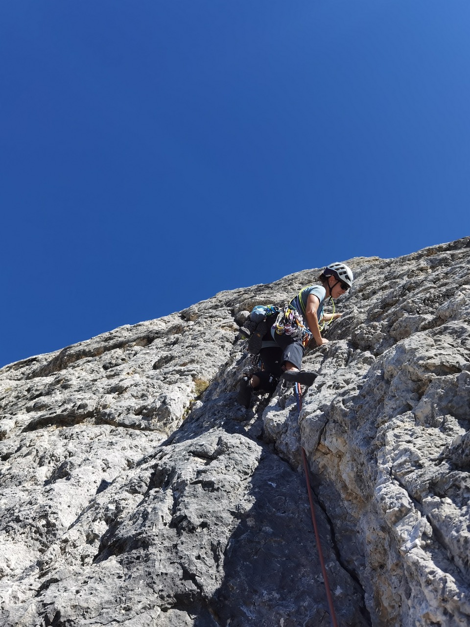 - Ajda Vodnjov: Tabor Dolomiti 2025 nas je razvajal z več kot popolnim vremenom, čudovitimi smermi in neprecenljivo družbo. Moj namen je bil, da čim več plezam naprej – in res sem vsak dan dobila priložnost, da sem segla čez svoje meje. Prvi dan sva z Vido dobili Boruta, ki je s svojo mirnostjo in nalezljivo pozitivnostjo poskrbel, da sem brez treme vlekla raztežaje naprej. Klin, ki sem ga zabila tako, da ga niti on ni mogel izbiti, bo ostal mali spomenik prvega dne – Michela pa je dobila novi klin. Drugi dan je bil v znamenju Mateja – tam ni bilo prostora za hec. Sama sem potegnila Spigollo Alpini, Matej pa je komentiral vsako sidrišče, preverjal in poslikal vse metulje in me usmerjal v težje variante. Rezultat je bila tura, ki je bila hkrati najbolj poučna in najbolj »za ego boleča«. A ravno takšne ture prinesejo največjo rast. Zadnji dan sem bila v navezi z Andrejem, ki je s svojo mirnostjo in preudarnostjo poskrbel za idealen zaključek. Via del Buco Bassa Variant sva splezala hitro, izmenično in ob tem še vedno skrbno vadila nameščanje varovanja. Inštruktorji so bili neverjetno prilagodljivi – poslušali so naše želje in strahove, nas spodbujali, usmerjali, nam vlivali zaupanje ter delili neprecenljive napotke. V treh dneh so nam predali neopisljivo količino znanja in izkušenj, kar je resnično izjemno. Iskreno hvala vsakemu posebej in celotni ekipi skupaj – za potrpežljivost, znanje, humor in podporo, s katero so iz tabora naredili popoln vikend v skali. Ogromna zahvala tudi KA PZS za organizacijo in izvedbo – takšni dogodki so prava življenjska popotnica!